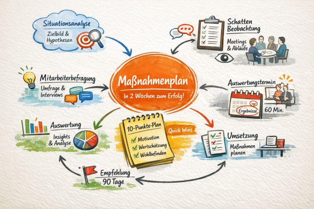 Mitarbeiterbefragung (anonym) oder Interviews (4–6 × 30 min) – quer durch die Organisation